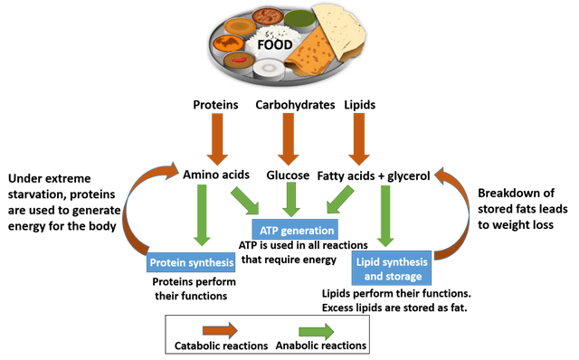 Metabolism refers to a set of chemical reactions occurring in a living cell for sustaining life. Metabolic reactions generate energy from food, synthesise organic compounds that serve as building blocks of biomolecules and excrete toxic wastes. Metabolic reactions can broadly be classified as catabolic or anabolic. Catabolic reactions break down larger molecules into smaller ones and release energy in the process. Anabolic reactions synthesise larger biomolecules from smaller ones by consuming energy. Metabolism can be considered as the sum of anabolic and catabolic reactions. Catabolic reactions produce the energy required for all cellular activity, while anabolic reactions help in formation and growth of cells and tissues.